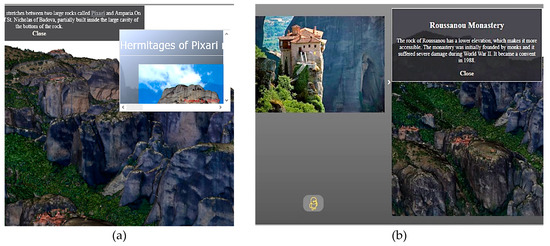 The menu’s content, which provided general facts prior to the tool’s activation, is adapted to the corresponding information for the featured landmark. Historical and cultural information, ortho-photos and other photographic evidence configure and enrich each one of its customized versions. The text is displayed in dialog popup windows while images either in a slider on the side panel of the webpage or in their full size though redirection to the digital image galleries of the platform. The dynamically modification of the navigation bar by assigning specific content to each hotspot is based on JavaScript conditions and jQuery events. Each hotspot is declared as a case of the switch statement and each case encloses the code with the actions enabled if this hotspot is clicked. The menu index is updated via jQuery selectors and the click, toggle and toggleClass events. As more and more click event handlers are added, it is necessary to unregister previous handlers by the .off(click) statement.