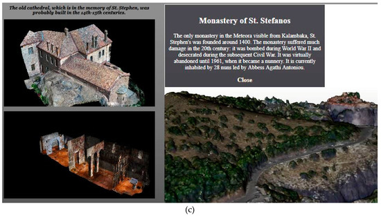 The user can freely explore it, examine the cursor’s behavior and select the landmarks that elicit his/her attention. Once clicked, relative contextual information appears to a dialog box on top of the canvas. The brief description contains links that redirect to the subpages and the photographic collections of the 3D platform. The static and passive knowledge divulgation evolves to an interactive experience and the spatial relationship among the particles of the platform turns into logical. Prior to browsing, a preview of the redirected page is shown so as the users anticipate and inspect its content before the navigation. At the same time, a customized photographic collection, which can be also displayed on an independent full-size viewer, is presented on the side panel. Replacing the image collection by a collection of smaller-scale and more detailed 3D models of the dataset maximizes the platform’s potential. The user can interact with the 3D assets within the new viewports or on their subpage’s viewer with further functionalities (Figure 13). Such a scalable visualization communicates the documentation outputs that emerge from multiple data acquisition techniques, time periods or disciplines to the simple user. The experts can compare and extract the topological, directional and metric relations among multi-resolution models. The exploratory analysis of the 3D scene and its supportive dataset is implemented on top of Meteora model and the points of interest are the six functioning Monasteries, the rock of Pixari and the town of Kalampaka and Kastraki. Their characteristic position, roof’s color and assembly make them readily apparent and no highlighted geometry or label is needed for interactivity. Under other conditions, a proper indication is needed for users’ usability.