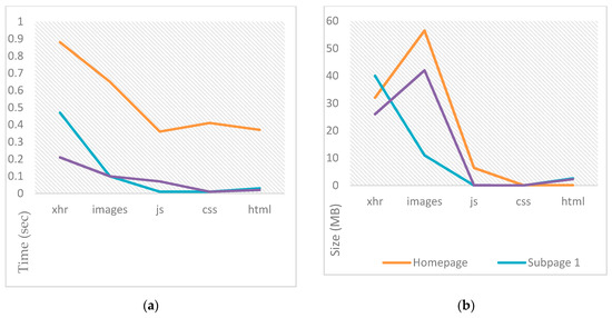 Cashed content used normally for each page of the platform: (a) Resources loading time (sec) (b) Size of data transferred (MB).