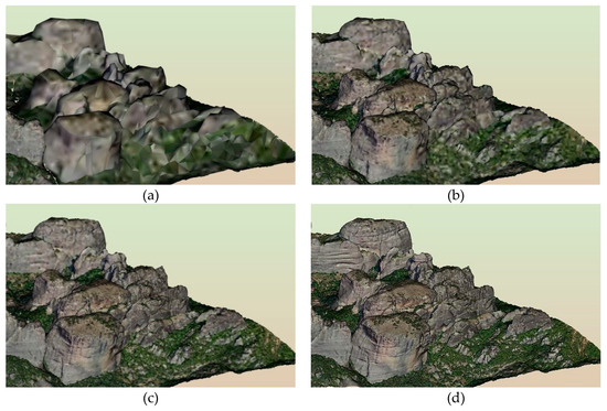 Finally, a demonstration of the visualization efficiency of the multi-resolution method is conducted in a section of the 3D model of Meteora. The parameters of this specific frame of the scene are stored in a vector and set as the default view. With time step of 0.5 s from the homepage’s startup the stages of the visualization refinement are recorded (Figure 16). At initial loading (0.5 s), a low-resolution and “rough” version of the 3D model is already visible in the homepage. The speed of rendering and loading is remarkable as at two seconds after homepage launch the high-resolution model is well defined. The stages of the progressive refinement can be observed in Figure 15. The low analysis corresponds to the less detailed and smaller data chunks of the multi-resolution schema and the visualization is improved on-the-fly.