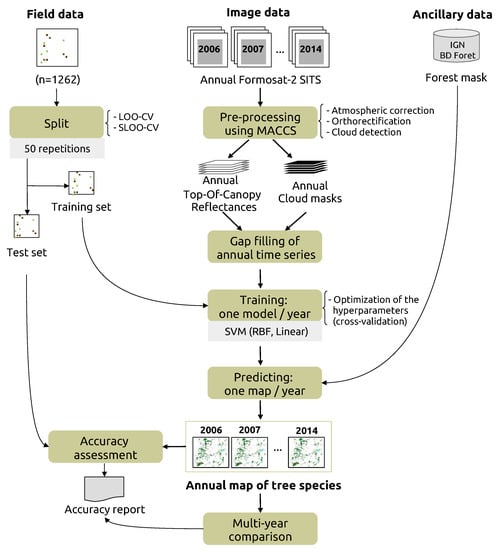 A global overview of the classification protocol applied on each Formosat-2 single-year time series is shown in Figure 3.