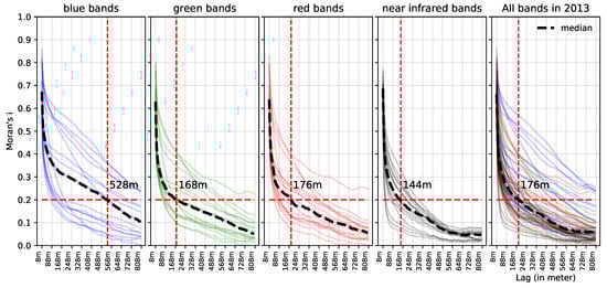 In this study, Moran’s I was computed for each spectral band of each year, for neighborhoods (lags) varying from 1 to 100 pixels (i.e., from 8 m to 800 m). Based on correlograms, we evaluated the distance between nearby pixels for which Moran’s I equals 0.2, considering the potential effect of spatial autocorrelation as not significantly different from the thresold value of Moran’s I []. Then, the median distance was calculated for each spectral band, taking all the dates of one year into account (Figure 5). This was done for each year. Finally, the average value of the median distance of each year was kept in the spatial cross-validation procedure to split the training and test sets. This average value was estimated to be 340 m (i.e., 42 pixels).