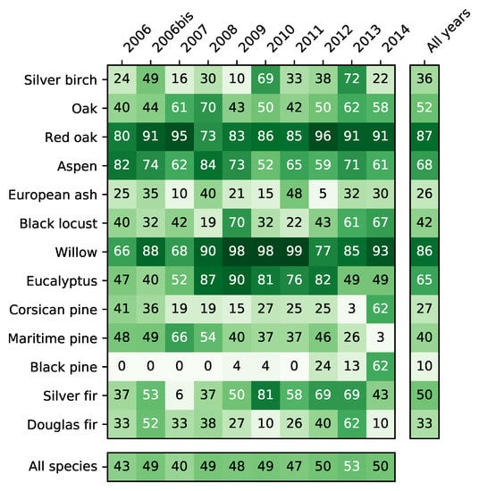 In most cases, whatever the year, broadleaf tree species were better discriminated than conifers (Figure 6). The highest performances were obtained for monospecific plantations of Red oak (average F1 score = 87%) and Willow (average F1 score = 86%). Aspen was also detected with good accuracy (average F1 score = 68%). Conversely, some species were difficult to identify, including European ash (average F1 score = 26%) and Silver birch (average F1 score = 36%) except in the years 2010 and 2013.