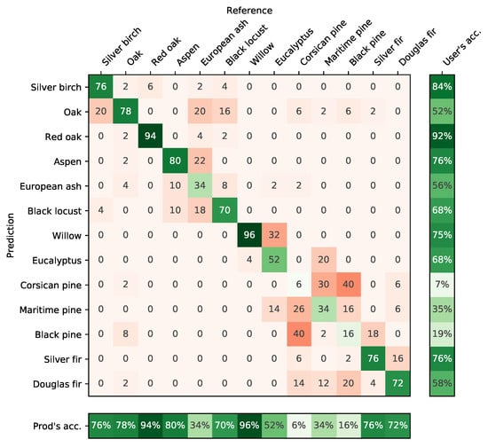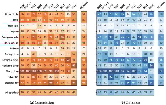 Generally, when errors occurred, the broadleaf tree species were confused with each other as well as with conifers. The main source of omissions for Silver birch was mispredictions as Oak which, in turn, was confused with European ash but also with Black locust and with some pines (see the confusion matrix for the year 2013 in Figure 7, for example). Red oak was the subject of very little confusion. High rates of omissions were observed for European ash with misclassifications as Oak, Aspen and Black locust. Under-detection was also observed for the evergreen Eucalyptus plantations due to confusion with Willow. In conifer species, the errors mainly appeared between species of Pine but also between Pine and Douglas fir.