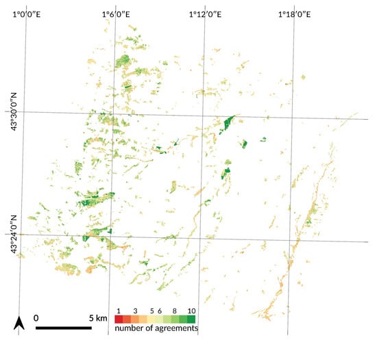 Spatial comparison between the annual classifications of forest tree species from 2006 to 2014 (including 2006bis). The number of agreement is the modal value related to the class with the highest frequency. This map illustrates the stability of predictions from one year to another with a high number of disagreements in red (high uncertainty) and a low number of disagreements in green (high accuracy). In many cases, homogeneous green areas are tree plantations of broadleaf species such as Red Oak and Aspen or Eucalyptus.