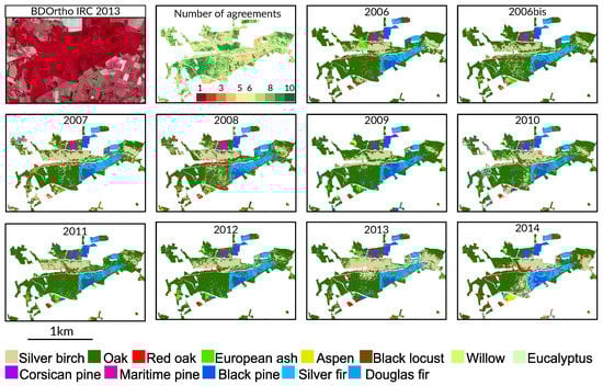 When spatial uncertainty was analyzed using the map of agreements between the one-year classifications, good stability was observed in the monospecific tree plantations of broadleaf species (Figure 9). The stands composed of Aspen, Red oak, and Eucalyptus were clearly differentiated. In contrast, in complex forests including a mix of different species, disagreements between annual classifications were higher, as suggested by the previous statistical assessment. An example is given in Figure 10 showing a mix forest composed of conifers (mainly Black pine but also Douglas fir and Silver fir) and deciduous species (mainly Oak and Silver birch). There was considerable confusions between conifer species from one year to another (low agreement). The extent of Silver birch areas was also highly variable. In this forest, the dominant species were rather well-identified but their exact location was inaccurate at the pixel level.