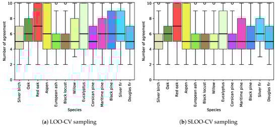 Distribution per species of the number of agreements between the annual classifications using all the predicted pixels for both the LOO-CV and SLOO-CV sampling strategies.