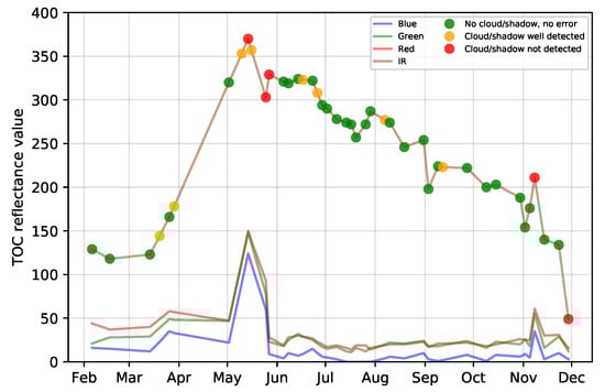 An in-depth visual analysis of the map products in fact revealed that misdetections of clouds and cloud shadows had a major effect on classification performances. When the forests were partially affected by clouds and cloud shadows or when these were under detected (which is what happened in the case of slight fog), spectral signatures were skewed and confusion between species was likely. This issue is illustrated in Figure 12 which shows changes in the reflectance values of an Oak pixel in 2006. On most of the dates, the pixel was free of clouds and shadows (green dots). In some cases, clouds or cloud shadows were found and the pixel values were gap-filled by linear interpolation (orange dots). But on certain dates, clouds or cloud shadows were not detected (red dots) and this influences the spectro-temporal signature. These dates had erroneous values but also had a negative impact on nearby gap-filled values since the dates are considered to be valid (e.g., see the 10th image in Figure 12). Another example showing an erroneous spatial pattern in a forest stand due to undetected clouds is provided in Appendix A Figure A3. This noise may influence the training step through the addition of inadequate support vectors, as well as the validation step, if the reference pixel to be tested is impacted by noise but the training pixels are not.