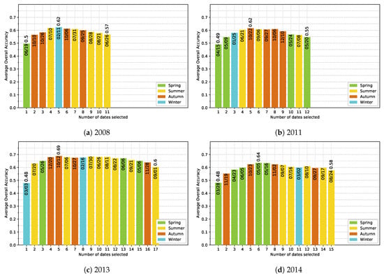 Globally, this analysis confirmed the difficulty to draw robust conclusions about the tangible contribution of seasonal variations in species discrimination. The most important dates were highly variable from one year to another because of the irregular acquisition dates. For instance, compared to 2008, the maximum classification accuracy of 2011 (OA = 0.62) was statistically equivalent, for the same number of dates (5 dates) after feature selection. However, the image ranking was quite different with more dates selected in autumn in 2008 compared to 2011 (Figure 13a,b). In 2013, the first two most important dates enabling to reach a similar level of accuracy (OA ≈ 0.62) were acquired in winter and summer which is still different in 2014 (Figure 13c,d; see Appendix E for full results). What appears to be constant in this additional analysis is the limited number of dates (around five) to reach maximum accuracy and the decrease in accuracy using all the dates. The identification of tree species is improved with the use of multitemporal images compared to single-date image but in a most effective way when feature selection is applied before training. The use of fewer features that contain the maximum discrimination information about the tree species classes is better than the use of all the features of which many of them could be correlated or irrelevant because of noise. These results confirms that the Hughes effect can occur using SVM, as already observed by []. This is also in line with the Zhu and Liu’s recommendations of selecting the most discriminative features before classifying forest types using dense time series [].