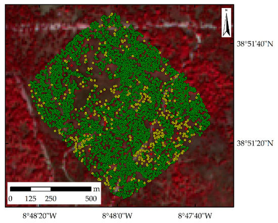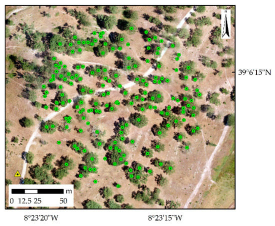 Figure 5) is a file with the centroid of each tree crown that was validated using the location of the cork oak trees identified within the in situ data collection sites (150 m diameter circles).