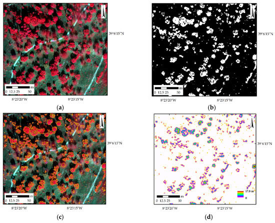 Figure 4b). However, this segmentation was not enough to segment individual tree crowns once several clusters of tree crowns are found in the image. Besides, some noise (e.g., clusters of a few pixels incorrectly identified as trees) was also present in the binary image. The next phase was to apply a low-pass filtering, using a 7 × 7 kernel size, in order to create a smoothing effect and therefore to remove noise. After noise removal, the binary image was converted into a polygon vector file with isolated trees and clusters of trees (