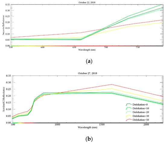 Both UAV and S2 spectral response (reflectance) for each defoliation class were analysed. In the case of the UAV images, only four spectral regions are available (green, red, red-edge and NIR), while for S2, all 10 and 20 m spatial resolution spectral regions, from blue (490 nm) to SWIR2 (2190 nm), were used.