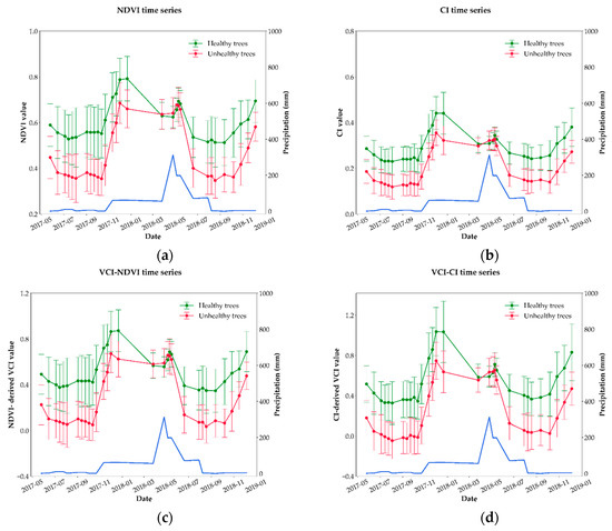 13], the temporal change of rate of the CI vs. the NDVI made it possible to distinguish trees in healthy conditions from those undergoing decline, and moreover that it can potentially be used to define decline levels.