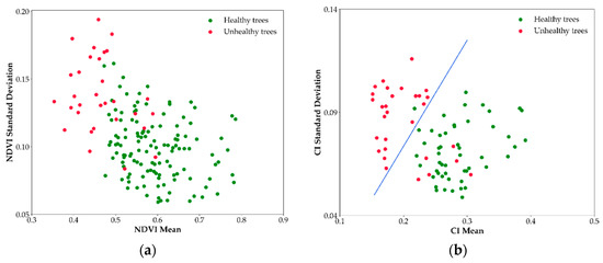 Analysis of the relationship between temporal mean and standard deviation for all VI indices allowed the evaluation of the temporal change rate for each tree using S2 data from 25 May 2017 to 6 December 2018. It is expected that healthy trees would have higher mean values and lower standard deviation values in opposition to unhealthy trees. This was verified by plotting the mean and standard deviation values for each tree obtained from each vegetation index time series. Best results were obtained when applying CI, enabling a clear separation between healthy and unhealthy trees with low omission and commission errors (