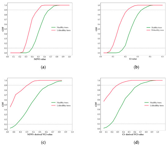 Figure 9 shows the cumulative distribution function for both classes of cork oaks considering NDVI and CI as well as the VCI associated with these indices for site HMG, NDVI, CI, and NDVI and CI-derived VCI values from September to October 2018 were used to define thresholds to separate healthy from unhealthy trees using a CDF. This time period was chosen since it corresponds to one of the periods along the year where the difference between the spectral responses of both cork oak classes is the highest. Thresholds were defined as the values for which the commission error for the class “unhealthy” is lower than a priori established value.