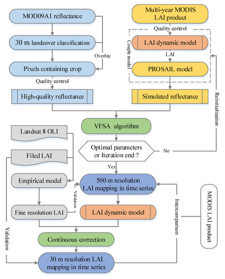 Given that the available number of MOD09A1 and Landsat observations is different, the very fast simulated annealing (VFSA) and continuous correction algorithms were used to estimate the time series LAI at 500 m and 30 m resolutions, respectively.