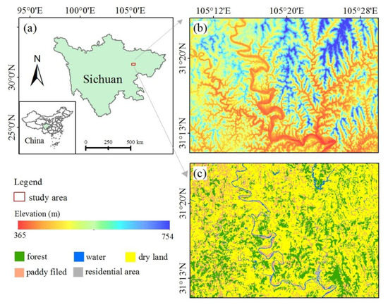 The study area (105°09″–105°50″E, 31°11″–31°24″N) is located in Yanting County, Mianyang City, Sichuan Province, China (Figure 2). The hills and low-mountains are the dominating landform types. The elevation gradually increases from south to north. The climate is a subtropical monsoon, with distinct seasons as well as concentrated precipitation. The study area is cross-distributed with paddy fields, dry lands and forests. Its summer crops are mainly rice and maize, the growing season of which is from April to October.