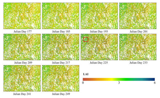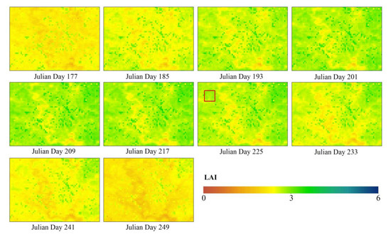 Figure 5. Spatial distributions of assimilated LAI values at the 30 m resolution. The white parts represent the non-crop areas, such as buildings, water, and forests, etc. The red square area on Julian day 225 is enlarged in Figure 6.