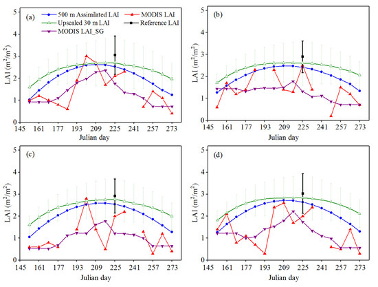 Figure 7 shows the temporal profiles of various LAI estimations over four randomly selected pixels corresponding to Figure 7a–d. As can be seen from Figure 7, the original and savitsky-golay smoothed MODIS LAI tend to underestimate the reference values. Meanwhile, the MODIS LAI values from the main algorithm display the missing phenomenon during the crop growth period. Moreover, although the quality of the MODIS LAI is high for these pixels, the temporal curves of products with frequent fluctuations do not match the actual LAI variation pattern in the crop growth period. In contrast, regardless of 500 m and 30 m, the assimilated LAI profiles generated by fusing both the dynamic model and remotely sensed observations are more continuous and smoother than MODIS LAI. They remove the abrupt rises or drops from MODIS products and continuously describe the temporal changes of the LAI in crop growth season. Thus, the assimilated LAI can better depict the growth status of crops, which is in line with the law of crop phenological changes. Owing to the introduction of Landsat 8 OLI data, the assimilated results at the 30 m scale are more detailed with varying standard deviations than those from 500 m resolution. It is apparent that the assimilated LAI values perform better than MODIS LAI products when compared to the LAI references at these pixels.