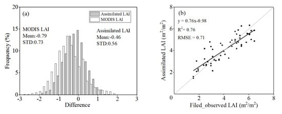 At the 500 m spatial resolution, Figure 8a makes it clear that the differences between MODIS LAI products and reference LAI values are between −2.5 and 1.8 with a mean value of −0.79 and a standard deviation of 0.73, which distributes in a wide range. Moreover, the LAI differences are less than 0 over 70% of the concerned pixels. This illustrates that the MODIS LAI products contain numerous uncertainties and underestimate the LAI references. The differences between the assimilated LAI results and references range from −2 to 1.2 with a mean value of 0.46 and a standard deviation value of 0.56. A high concentration near 0 is found, indicating that the assimilated LAI values at the 500 m scale are more accurate and in better agreement with LAI reference data, when compared to the MODIS LAI products.