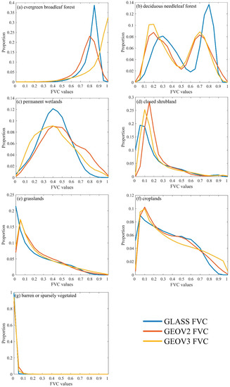 To further evaluate the spatial consistency of these three FVC products, the histograms of the GEOV2, GEOV3, and GLASS FVC values during 2014–2016 with different biome types are generated based on the MODIS land cover data and pre-processed monthly FVC products (Figure 3). Because there are some missing data in the GEOV3 product, only the pixels with available FVC values of all three products in the same period are adopted for statistical analysis. Additionally, several vegetation types, which are mainly distributed in high-latitudes, are also abandoned for further evaluation to avoid the disturbance of the missing data in GEOV3 FVC product (like Figure A1 in Appendix A), and finally the classes, including evergreen broadleaf forest, deciduous needleleaf forest, deciduous broadleaf forests, closed shrubland, grasslands, permanent wetlands, and croplands, as well as barren or sparsely vegetated, are used for further analysis. Generally, histograms of the three FVC products show excellent agreements over the adopted vegetation types, particularly in closed shrubland and croplands, where all three FVC products have similar distribution patterns. The spatial distributions for evergreen broadleaf forest of the GLASS and GEOV2 FVC products are more consistent than that of the GEOV3 FVC product. There were more pixels, which are concentrated between 0.6 and 0.95, in the GLASS and GEOV2 FVC products. In contrast, the GEOV3 FVC product has more pixels with higher values close to 1. For deciduous needleleaf forest, the GEOV2 and GEOV3 FVC products show better consistency with similar frequency distributions. However, the GLASS FVC product has more pixels between 0.65 and 0.9 over deciduous needleleaf forest. For permanent wetlands, the frequencies of the GLASS FVC values between 0.3 and 0.6 are higher than the GEOV2 and GEOV3 values. For closed shrubland and croplands, all three products achieve excellent agreements in the frequency distributions. For grasslands, the GLASS FVC product showed more pixels with low values close to 0. For barren or sparsely vegetated regions, most of the FVC values of these products were less than 0.1.