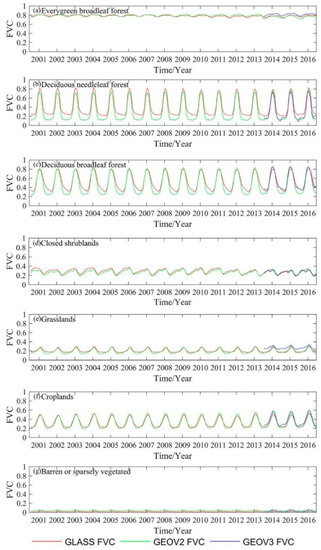 To compare the temporal consistency, the mean FVC time series values from the GEOV2 (2001–2016), GEOV3 (2014–2016) and GLASS (2001–2016) FVC products with different vegetation types are shown in Figure 4. By visual observation, the varying magnitude of all the FVC products are coincident with the corresponding vegetation types. For evergreen broadleaf forest, the GLASS and GEOV2 FVC values have stable consistency, showing slight seasonality and maintaining high FVC values throughout the year. However, overall, the GEOV3 FVC values are systematically 0.05 higher than the GLASS and GEOV2 FVC values for evergreen broadleaf forests. For deciduous needleleaf and broadleaf forests, the main discrepancies between GLASS and GEOV2 FVC products occur during the seasons with low FVC values, when the GEOV2 presents clearly smaller FVC values than the GLASS product at valley values. The GEOV3 FVC product shows more agreements with the GEOV2 FVC product over deciduous needleleaf forests. Nevertheless, there is better consistency between the GEOV3 and GLASS products in deciduous broadleaf forests. For closed shrubland and croplands, all three FVC products achieve similar temporal variations and seasonal dynamics. For grasslands, the GEOV3 product presents smaller seasonal dynamics and higher FVC values than both the GEOV2 and GLASS FVC products, which present stable temporal consistency. For barren or sparsely vegetated biomes, all of these products have low inter-annual variations, as expected, and the GEOV2 values were slightly higher than the GLASS values.