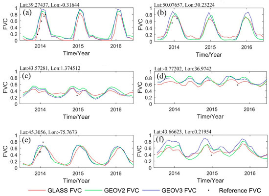Figure 5 shows the temporal profiles derived from the GEOV2, GEOV3, and GLASS FVC products over the site locations from Table 2. For better visual presentation and comparison, the reference FVC values of the selected sites are exhibited in Figure 5. In Figure 5a,d, both the GEOV2 and GEOV3 products have similar seasonal dynamics and magnitudes, whereas the GLASS FVC values are smaller than those of GEOV2 and GEOV3 for the rice, tree plantation, tea and coffee vegetation types during the growing season. In Figure 5b,f, the GEOV2 and GLASS FVC products achieve reliable agreement in wheat, barley, corn, sunflower and soybean croplands. However, the GEOV3 values are over 0.15 higher than the GEOV2 and GLASS FVC values during summer. Furthermore, all these FVC products demonstrate satisfactory temporal consistency in Figure 5c,e, which are covered by wheat, corn soybean and grass. Generally, all these time series of different FVC products present consistent seasonal dynamics and magnitude ranges with corresponding vegetation types. Obviously, the GEOV2 and GLASS FVC products show complete temporal continuity, whereas the temporal profiles of the GEOV3 FVC product are discontinuous with poor-quality temporal continuity.