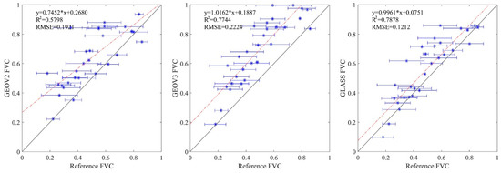 The scatterplots of the three FVC products and the reference FVC values are shown in Figure 6. The RMSE of the reference FVC data is taken as the error bar in Figure 6, which aims to visually indict the uncertainty of reference data. Obviously, the GLASS FVC product has better consistency with the reference data compared with the GEOV2 and GEOV3 FVC data. A regression equation with a 0.7452 slope and a 0.2680 intercept is established between the GEOV2 FVC product and reference FVC values in Figure 6a, which presents high uncertainty and overestimation of small estimations based on the available reference data. In Figure 6b, a clear systematic overestimation (up to approximately 0.2) of the reference data is observed for the GEOV3 FVC product, whose regression equation has a slope of 1.0162 and an intercept of 0.1887 with the reference data. Furthermore, the GLASS FVC product achieves a more reliable accuracy (R2 = 0.7878, RMSE = 0.1212) than the GEOV2 (R2 = 0.5798, RMSE = 0.1921) and GEOV3 FVC data (R2 = 0.7744, RMSE = 0.2224) over the reference FVC values. In addition, considering the uncertainty of the reference FVC values in each field site, there are 8, 3 and 16 sites within the error range of the GEOV2, GEOV3, and GLASS FVC products, respectively. This finding further indicates the better performance of the GLASS FVC product with the available reference FVC data.