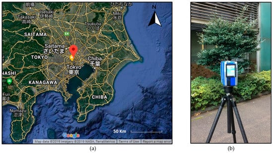 The terrestrial LiDAR (Light Detection and Ranging) used in this study was a Focus3D X330 (FARO, FL, USA) weighing 5.2 kg with a vertical field of view of 300° and a horizontal field of view of 360°. The measurement speed was 122 to 976 kpts/sec (kpts: thousands of points), with a scan range between 0.6 m and 330 m, a wavelength of 1550 nm, a distance ranging error of ±1 mm, and an angular resolution of 0.009° for each angular scan. The field trial was conducted at the University of Tokyo (Figure 1a), which is located at 35°43’03.1”N 139°45’43.4”E, on 12 November 2018, and the day was windless and sunny. The sampled species included the mochi tree (Ilex integra) and the Japanese camellia (Camellia japonica), which were well isolated and themselves surrounded by the same species. The leaf lengths of the mochi and Japanese camellia tree were approximately 12 and 4 cm, respectively, and the tree heights were 4.5 and 3 m, respectively.