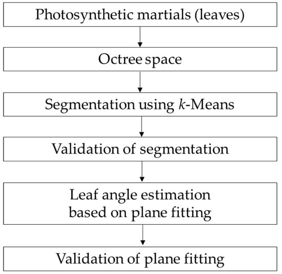 As a necessary process for obtaining appropriate leaf segments to fit the surface, leaf angles estimated from the fitted plane of the leaf PCDs have been manually extracted from entire LiDAR-derived PCDs [22,23]. Yet, the process of manual segmentation of leaf PCD is time-consuming. In most cases, manual segmentation is not recommended for complicated canopy structures, while automatic segmentation still presents challenges. An algorithm that automatically separates LiDAR-derived PCDs into acceptable clusters has been reported. In the reported method, the LiDAR-derived PCDs were regularly segmented into clusters using sequence cubic grids [24]. Moreover, neighboring points of center were repetitively selected to group the clusters within a certain Chebyshev distance (e.g., 1 cm) [25] as well as triangular intersect regions [10]. Similarly, the application of a k-nearest-neighbor algorithm (KNN) is an option that groups points based on the distance of the k-number [16]. In addition, classification with a mixed Gaussian model and an expectation/maximization (EM) algorithm also show great potential [26].