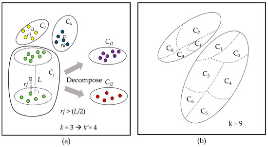 The k-means involves iteratively exploring the centroid of every cluster and then picking and regrouping the near points into a new group. Figure 3a displays the changes in the class boundary and cluster centroid between the nth and (n + 1)th iterations. As shown, in the nth iteration, point p was closer to the centroid of the leaf a. However, it was grouped with leaf b (), which did not lead to the smallest sum of the distance between the points and the cluster’s centroid within the group. Therefore, the leaf PCDs were reorganized to group the p point with leaf a, where , and the iteration ended in , which was the smallest. For instance, assuming that in the (n + 1)th and (n + 2)th iterations were equal, the iteration stopped at the (n + 1)th iteration because the cluster in the (n+1)th iteration was the smallest.