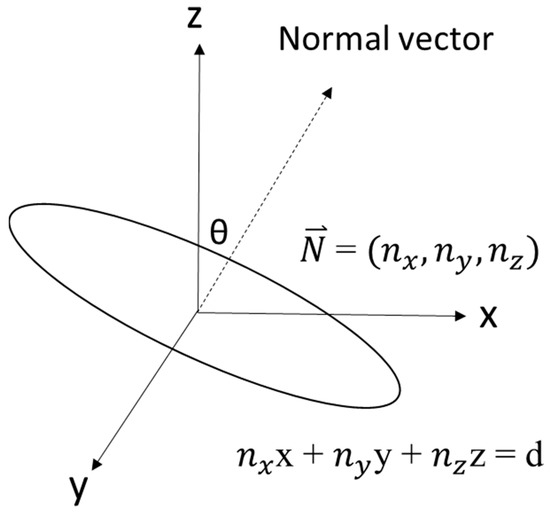 Here, is the normal vector (). The normal vector () of the fitted plane was obtained using the least-squares method [26]. The fitted plane has the smallest distance between the plane and the points of clusters. The least-squares method calculates the plane as follows: