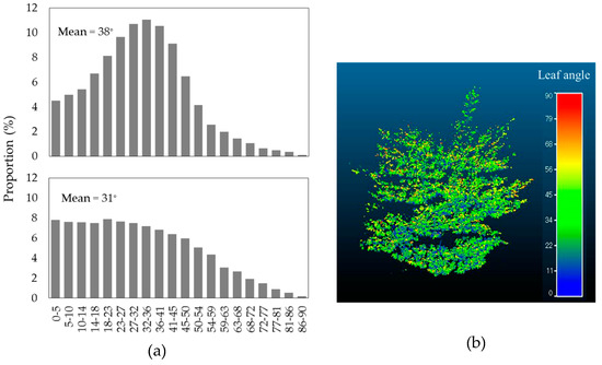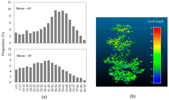 Leaf angle distribution (LAD) in the Japanese camellia: (a) LAD graph for the tree’s top (4.5–2.3 m) and bottom (2.3–0 m); (b) LAD image of the whole tree.