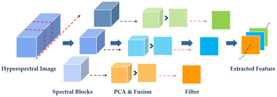 Then, the PCA technique is carried out and m principal components are remained for each block. The fusion operation is further implemented on m principal components by using the traditional averaging strategy. Therefore, we can totally obtain K fused bands and the element can be denoted as . Then, according to the authors of [48,49], we carry out the edge-preserving filtering on each fused band. Therefore, our finally obtained small cube can be described as follows,