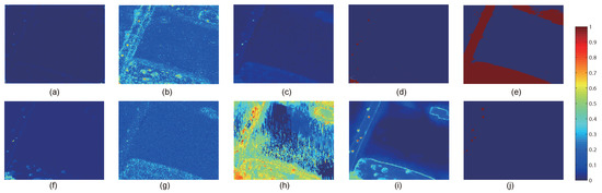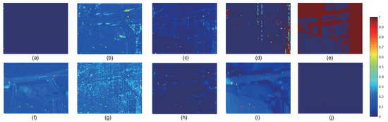 The visualization results of different detectors on AVIRIS Airport. (a) LRX: window size (19,9); (b) SRD: window size (17,9); (c) GRX; (d) RSAD; (e) BACON; (f) LSMAD; (g) DL; (h) Ours-DL-S; (i) Ours-DL-SS; and (j) Ground truth. Anomaly probabilities are denoted by the values in the color bar.