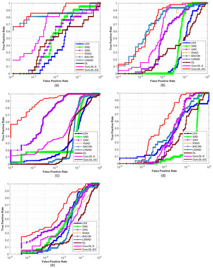 Figure 5 illustrates the visualization pictures of all the detection methods on AVIRIS Airport hyperspectral image. Similarly, BACON has a serious problem of high false alarm rate. As for RSAD, it can significantly detect all the anomalies with less background detection mistakes. LRX seems to completely miss all the abnormal targets. The result is hard to estimate for SRD from its visualization map. DL also contains lots of background clutter. As for GRX, LSMAD, Ours-DL-S, and Ours-DL-SS, they show the similar detection results for all the targets have been effectively detected. The most difference is that anomalies are highlighted with different intensities by them. Compared with the other three methods, Ours-DL-SS is better for its detected targets are much more notable while the background is well suppressed. To carry out a fair and convincing evaluation of the detection performance, we further analyze ROC curves and AUC values on this image. From Figure 9b, it can be seen that Our-DL-SS defeats all the other methods except for LSMAD, because its ROC curve lies above their ROC curves. Comparing with LSMAD, when the false positive rate takes the smaller value, the detection rate of our method is slightly lower than that of LSMAD, but when the false positive rate takes a larger value, our ROC curve will keep above LSMAD. From the results shown in Table 1, we can see that our method obtains the highest AUC value. On the whole, all the results have demonstrated the good performance of the proposed method. It has good distinctiveness to recognize anomalies from the real scene.
