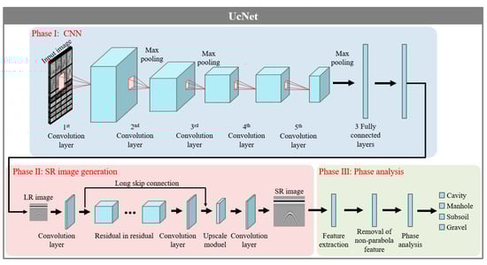 Figure 2 shows the overview of proposed UcNet consisted of the three phases, i.e., Phase I: CNN, Phase II: SR image generation, and Phase III: Phase analysis. First, the reconstructed 2D GPR grid images are fed into CNN for data classification. Subsequently, the cavity and gravel data classified in Phase I are transmitted into Phase II to generate their SR images from original low-resolution (LR) images. Finally, the phase analysis of the SR images is conducted in Phase III to update the classification results obtained in Phase I. Through these sequential processes, misclassification between the cavity and gravel cases can be minimized. The details of each phase are as follows.