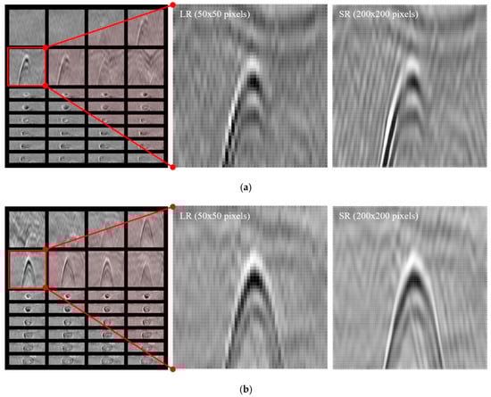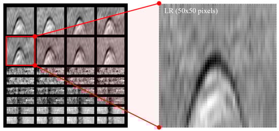 Phase II: Once the underground objects are classified by Phase I, the cavity and gravel images are automatically transferred to Phase II. The reconstructed GPR grid image is comprised of eight B-scan and 24 C-scan images. The original sizes of B- and C-scan images are 50 × 50 and 50 × 13, respectively. To proceed Phase II, the 5th representative B-scan image is selected from each reconstructed GPR 2D grid image. Since the resolution of the selected B-scan image is not enough for Phase II as shown in Figure 4, the subsequent SR image generation process is necessary.
