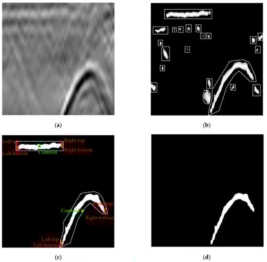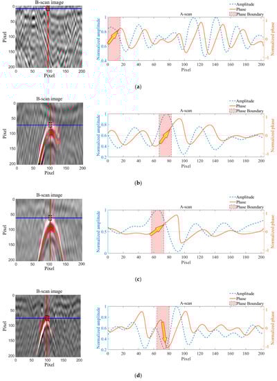 From the Phase I results described in Figure 12, Phases II and III were subsequently carried out. Figure 13a–d shows the representative SR B-scan images which are especially misclassified in Phase I. Figure 13a,b indicates the representative cavities cases misclassified as gravels, and Figure 13c,d shows vice versa. The misclassification results show very similar geometric features to each other, but the phase information at the parabola boundaries are distinctive between the cavity and gravel cases. In particular, although the LR GPR B-scan images has ambiguous pixel-level boundary information, the SR images show that much clearer parabola boundary information, making it possible to conduct the precise phase analysis in the subsequent Phase II.