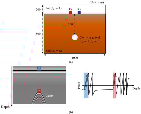 Numerical simulation of phase analysis: (a) 2D simulation model, (b) cavity case, and (c) gravel case. The dashed blue box, line red box, and dotted green box in the B-scan images correspond to the locations of the radiated wave, cavity, and gravel boundaries, respectively. (Tx: Transmitter antenna, Rx: Receiver antenna).