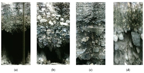 Representative core drilling results of (a,b) cavities and (c,d) gravels.