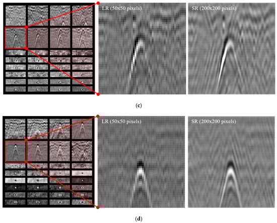 The SR image generation network was constructed by using the residual channel attention network [], which is one of the deep learning networks comprised of 500 layers and 1.6 M parameters for image resolution enhancement. This network utilizes the residual in residual structure and the channel attention mechanism to enhance the feature learning of high frequency channels, which is useful for reconstructing high-resolution images among the various channels that make up image data. The residual channel attention network consists of the four main parts, i.e., the convolution layer, residual in residual structure, upscale module, and last convolution layer. First, the convolution layer is shallow feature extraction for the input image. Then, the residual in residual structure extracts deep features through the high frequency information learning. The residual in residual structure is the very deep structure comprised of 10 residual groups, and each residual group consists of 20 residual blocks. Each residual group is connected by a long skip connection as shown in Phase II of Figure 2. This residual in residual structure allows the residual channel attention network to learn more effective high frequency information by skipping the low frequency through the skip connection. The shallow and deep feature data, which have passed through each residual block and group, are extended to the SR size through the upscale module. The upscale module is composed of a deconvolution layer consisting of 256 kernels with 3 × 3 size and a single stride, which increases the size of each pixel by four times in this study. Finally, it is restored as the SR image through the last convolution layer. The 800 training images from the DIV2K dataset, which is well known high-quality images with 2K resolution, were used as the training dataset []. Then, 100 images collected from Urban100 dataset were used as the validation dataset. The representative resultant GPR images between LR (50 × 50 pixels) and SR (200 × 200 pixels) are compared in Figure 5. The SR image is successfully generated without any information loss.