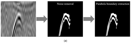Phase III: Once the SR GPR images are generated in Phase II, the phase analysis is subsequently carried out in Phase III. To automate the phase analysis of the SR images, the feature extraction, removal of non-parabola features, and parabola boundary extraction are continuously proceeded as shown in Phase III of Figure 2. Figure 6a shows the representative SR B-scan image obtained from Phase II. Since the B-scan image includes a number of noise components, the feature extraction with noise removal procedure is sequentially performed. First, a median filter is applied to the B-scan image for removing pepper noise components, and the filtered image is then normalized with respect to the maximum amplitude. Subsequently, the extreme value distribution with 95% confidence interval is applied to obtain the dominant features. However, since the remaining features still contain non-parabola boundaries, as shown in Figure 6b, it should be removed. The unwanted spotted and non-continuous features can be removed by eliminating non-continuous pixels less than 500, as displayed in Figure 6c. Note that the target detectable cavity size of 30 cm is equivalent to 500 pixels in the SR image. Next, the parabola feature can be extracted by using the gradient between the remaining objects′ centroid and the extremum of left- and right-side pixels. Since the empirical gradient value of typical parabolas is larger than 20°, only the parabola feature remains, as displayed in Figure 6d.