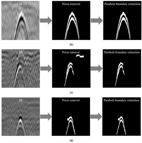 Figure 14a,b indicates the procedure of parabola boundary extraction results with SR and noise removal image corresponding to Figure 13a,b. All parabola boundaries are clearly extracted from the SR images even though unwanted noise and non-parabola features coexist. Similarly, Figure 14c,d shows that the distinctive parabola boundaries are successfully extracted, which correspond to Figure 13c,d.