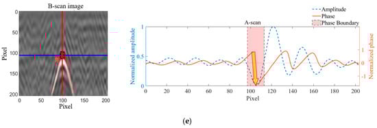 Figure 15 shows the phase analysis results corresponding to the extracted parabola boundary information in Figure 14. As shown in Figure 15a, of the radiated waves has 0.062 which is positive value. Then, the values of 0.0481 and 0.0336 shown in Figure 15b,c indicate that they can be considered as underground cavities, not gravel. Conversely, the values of the misclassified cases from gravels to cavities have −0.0803 and −0.1073 as shown in Figure 15d,e, respectively. These out-of-phase information physically imply the high permittivity of the object in comparison with the surrounding soil, meaning that they are most likely gravel in the designed category of UcNet.