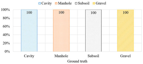 Table 1 summarizes the precision and recall values obtained from the conventional CNN results. As for the manhole and subsoil background cases, the precision and recall values are 100%, indicating that they are properly classified by the conventional CNN. On the other hand, 88.26% and 66.27% of the precision values in the cavity and gravel cases, physically meaning that false positive occurs. Similarly, the relatively low recall values of the cavity and gravel cases means the false negative alarm due to the misclassification between the cavity and gravel cases.