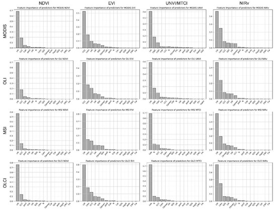 Similar results are found for each three subsets generated by full random sampling and, hence, we only show results for the first subset. Figure 2 shows feature importance scores of considered predictors given by RF for commonly used sensor VIs (results for MODIS-PRI and OLI-TCTG are shown later). It is shown that for most cases, MODIS-derived VIs show similar sensitivities to those of VIs derived from OLI, while VIs derived from the Sentinel family exhibit consistent sensitivities. This is because compared to MODIS and OLI, MSI and OLCI are narrow-band sensors and have relatively similar band settings. For almost all VIs, LAI is the most influential predictor. LAI is one of the key parameters describing canopy structure. In general, LAI determines the chance that incident solar photons interact with a leaf. For photosynthetically active radiation (PAR) bands and water absorption bands, a large LAI can induce strong canopy absorption of radiation and result in very low canopy ρ. For weak absorption bands, such as NIR, solar photons are strongly scattered by the leaves in a dense canopy with a large LAI, which can result in significant anisotropic canopy ρ [23]. Therefore, LAI has a large influence on canopy ρ at all bands, especially for longer wavelengths. Accordingly, all the VIs are sensitive to LAI.