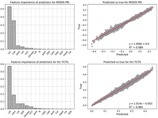Feature importance scores and scatter plots between true and predicted values for MODIS-derived PRI and OLI-derived TCTG.
