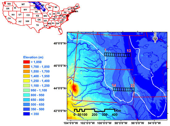 Location map of the US-PPR (Prairie Pothole Region) superimposed with the specific transects of AMSR (Advanced Microwave Scanning Radiometer) pixels in North Dakota (1–13) and South Dakota (14–23), 30m resolution digital elevation model (DEM), and rivers.