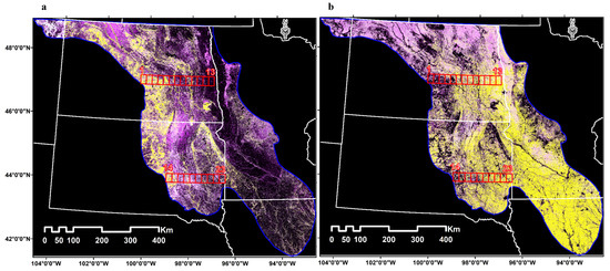 Persistency maps for (a) grassland/pasture, and (b) cropland. The persistency map is a false-color composite of CDL (Crop Data Layer) time series where: Red color plane was assigned to maximum % cover, Green to average % cover, Blue to range (max %-min %). Interpretation: Yellow → stable core areas, White → unstable core areas, Magenta → unstable periphery, Black → cover does not occur. Transects of AMSR pixels are outlined in red. Note that the grassland/pasture cover types (a) are dominated by shades of magenta to purple indicating higher interannual variation and low averages [36,37].